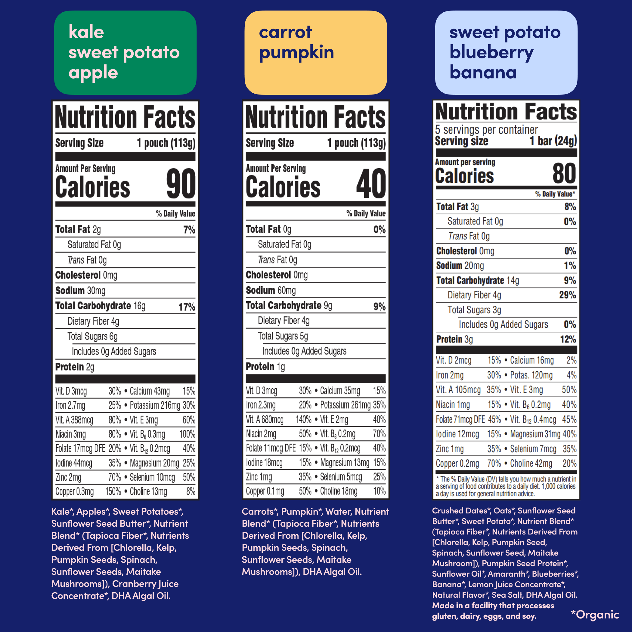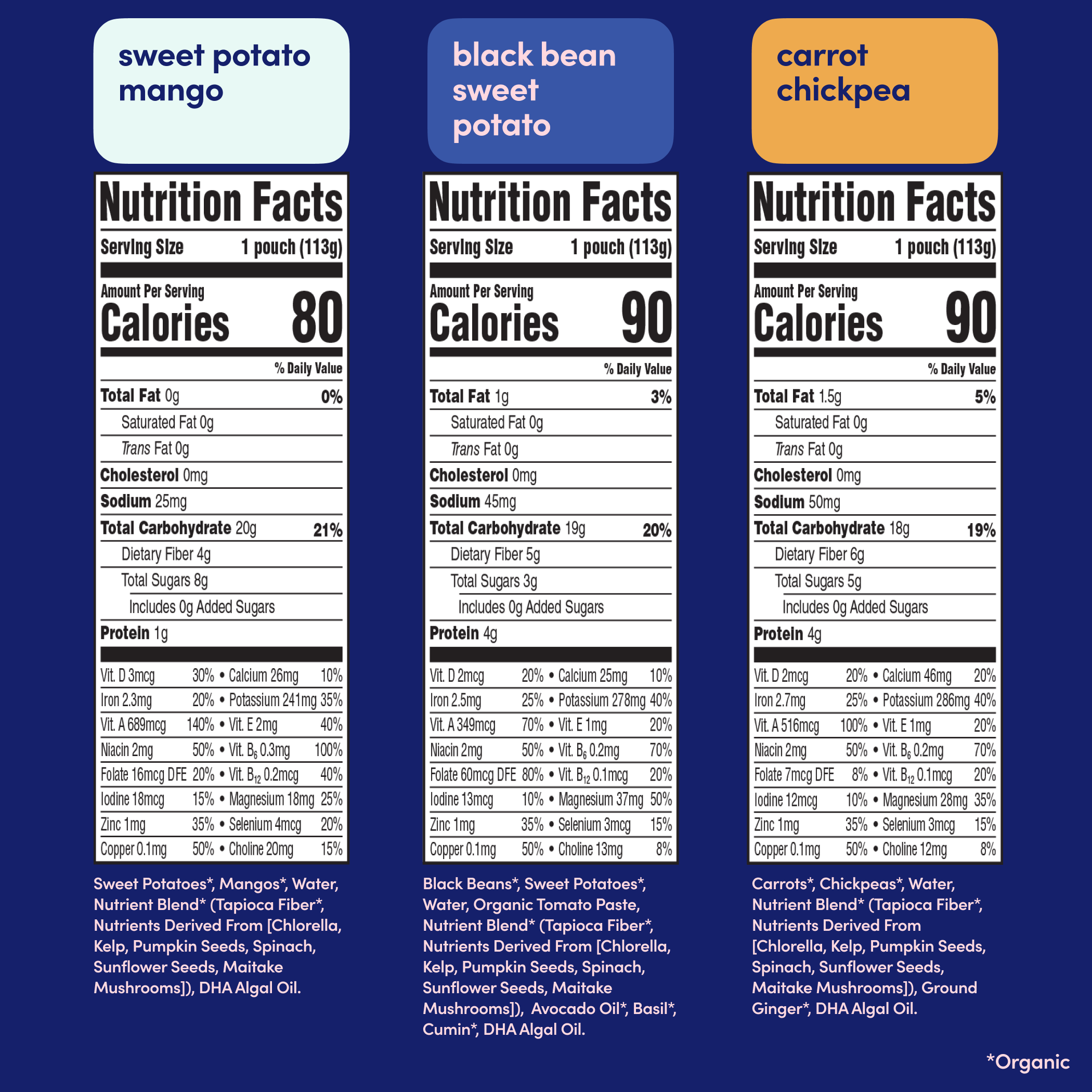 *Among competing baby food pouches with similar ingredients as of April 2024. Normalized per 113 grams.