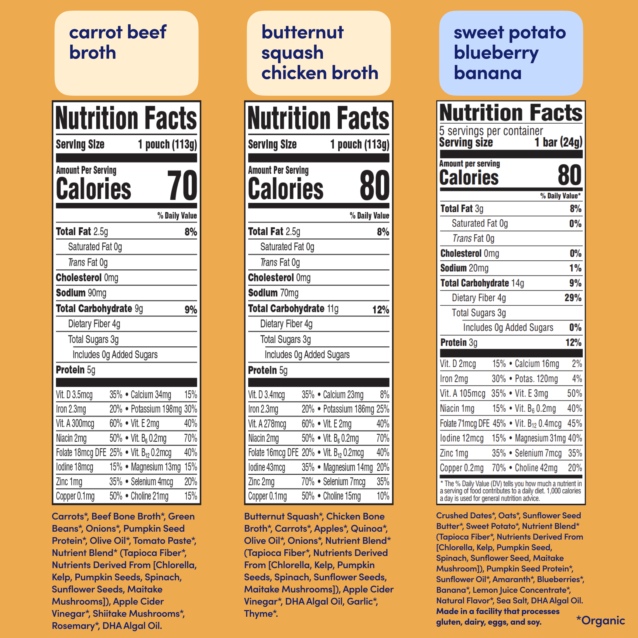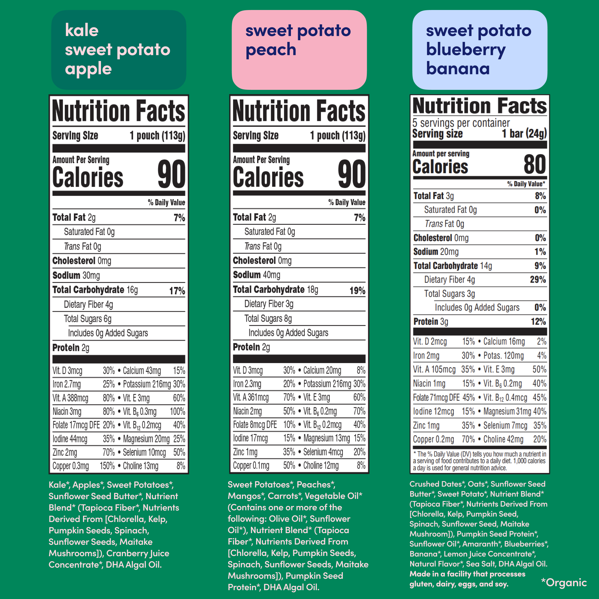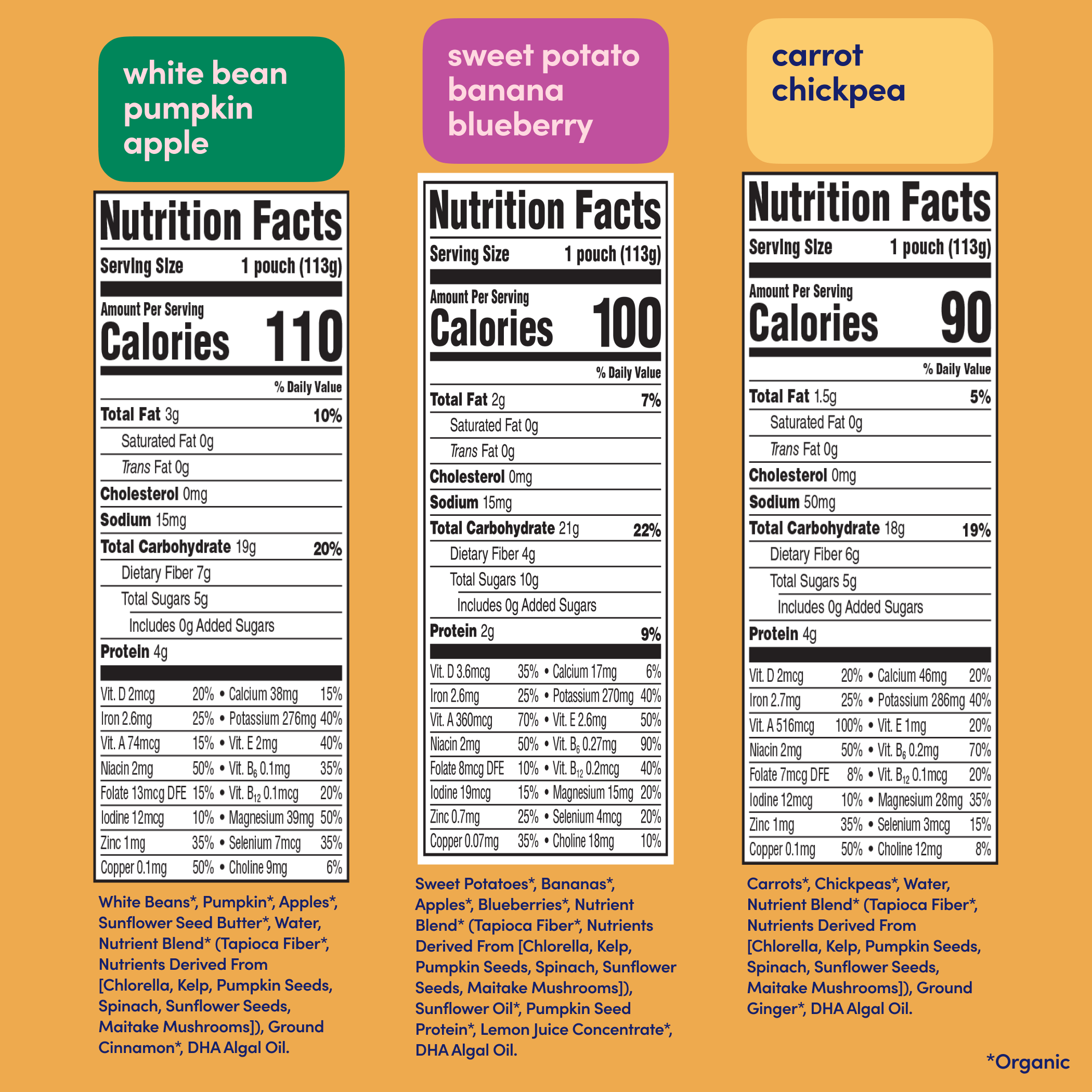 *Among competing baby food pouches with similar ingredients as of April 2024. Normalized per 113 grams.