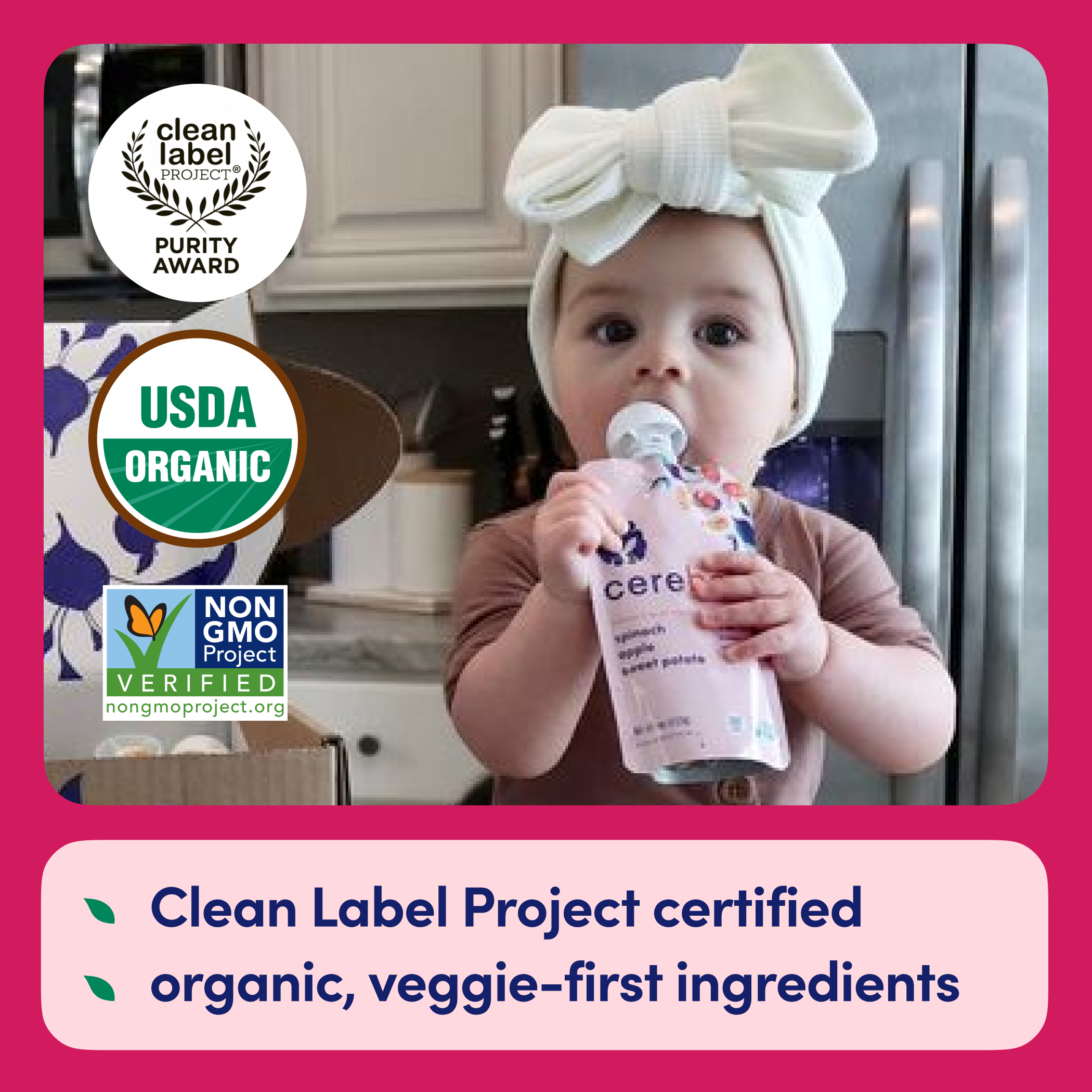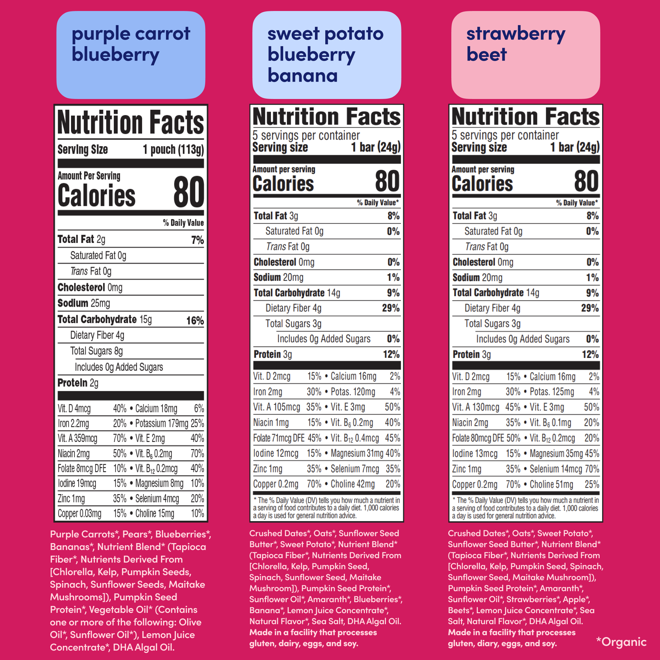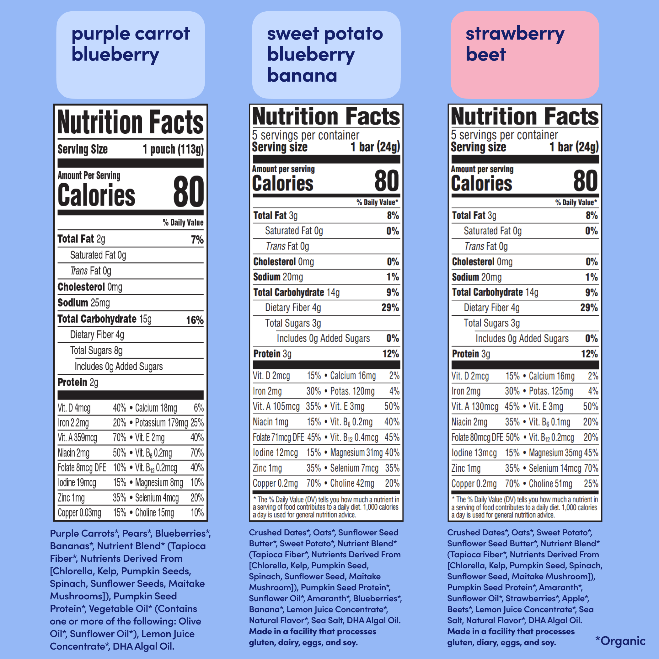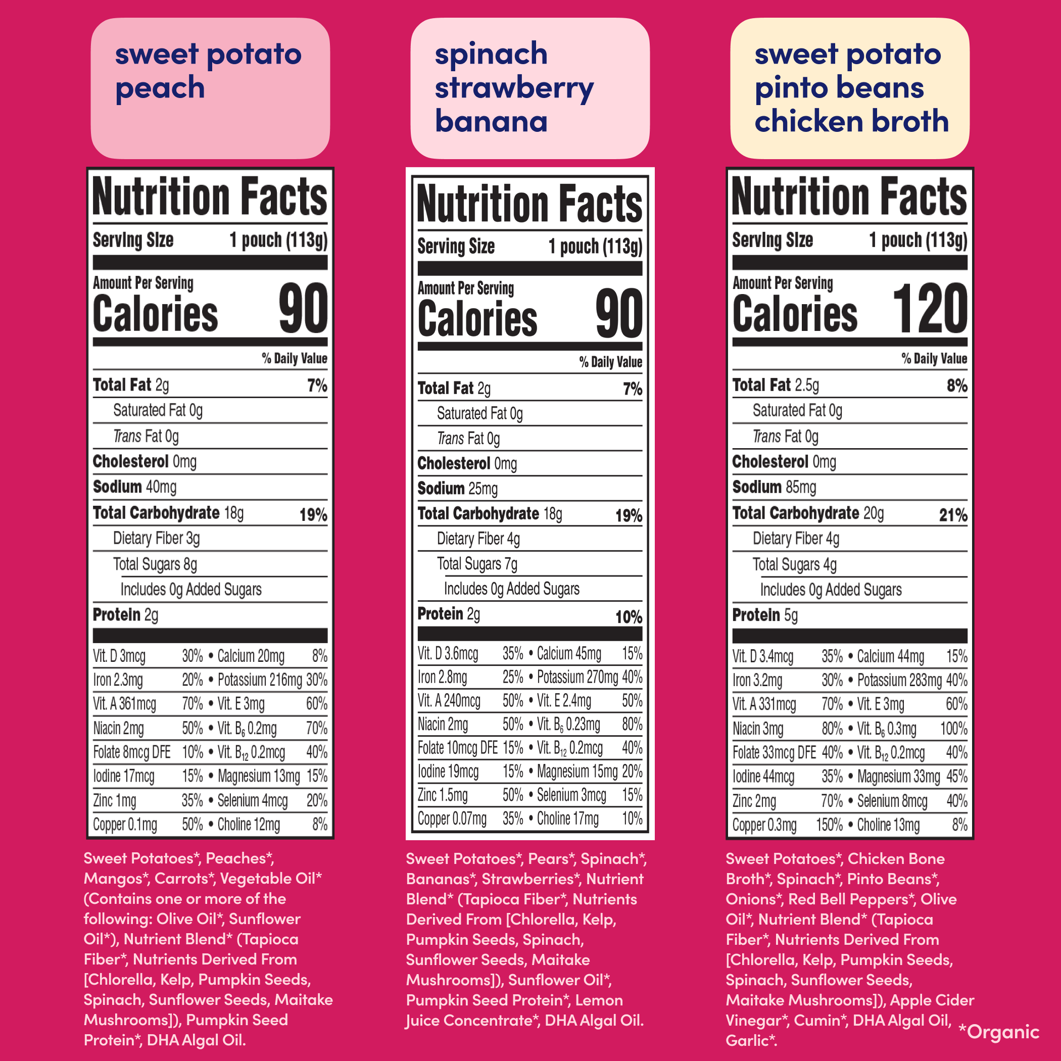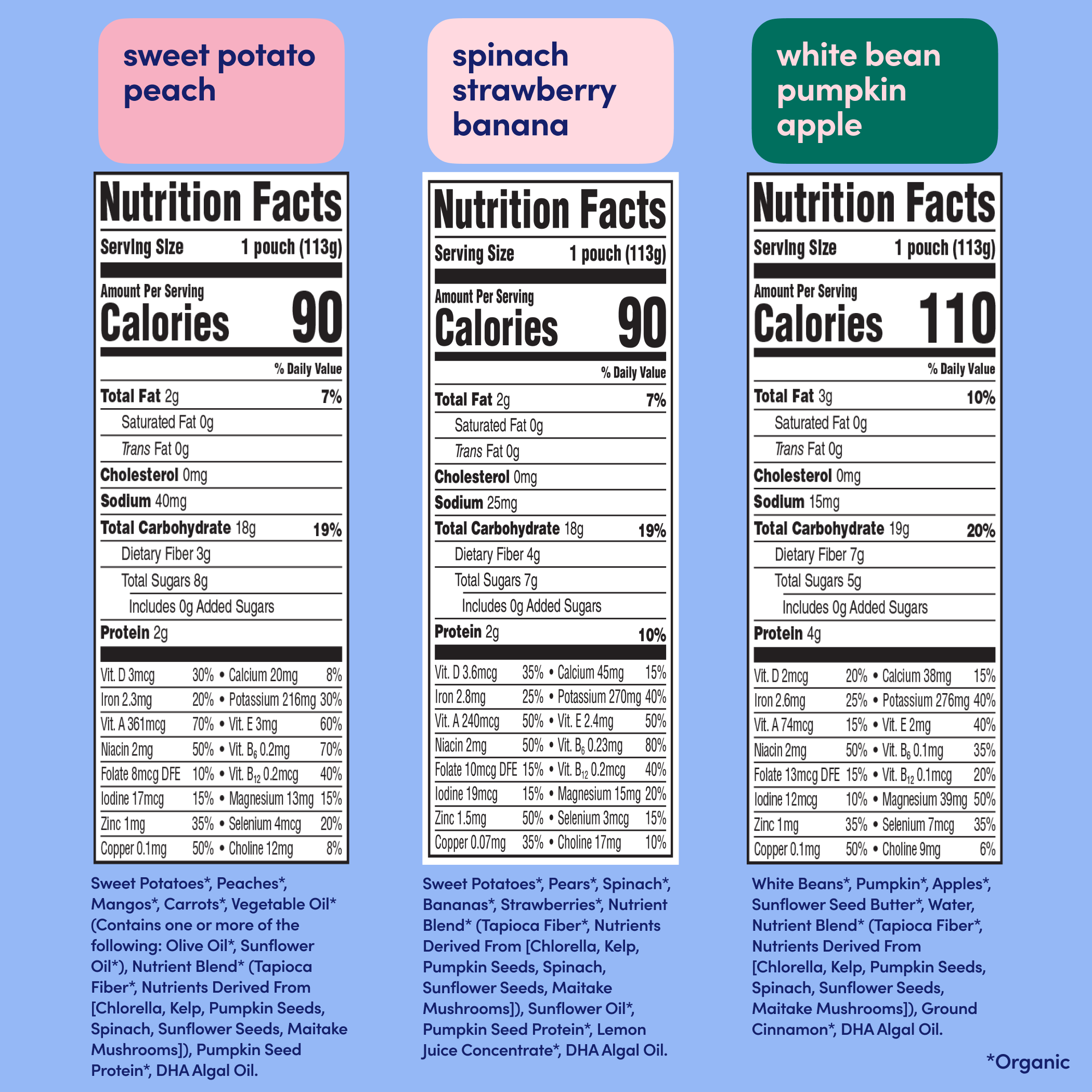 *Among competing baby food pouches with similar ingredients as of April 2024. Normalized per 113 grams.