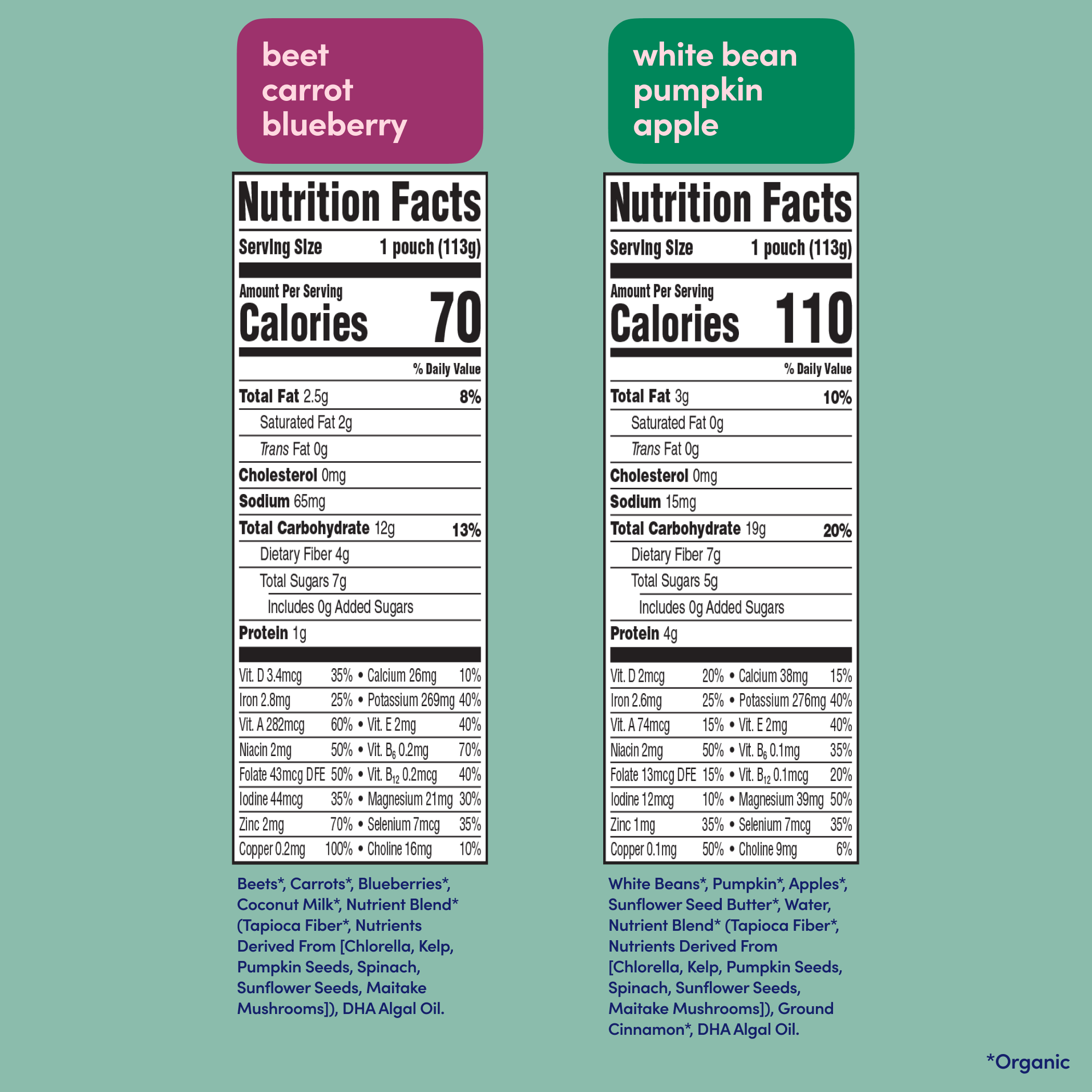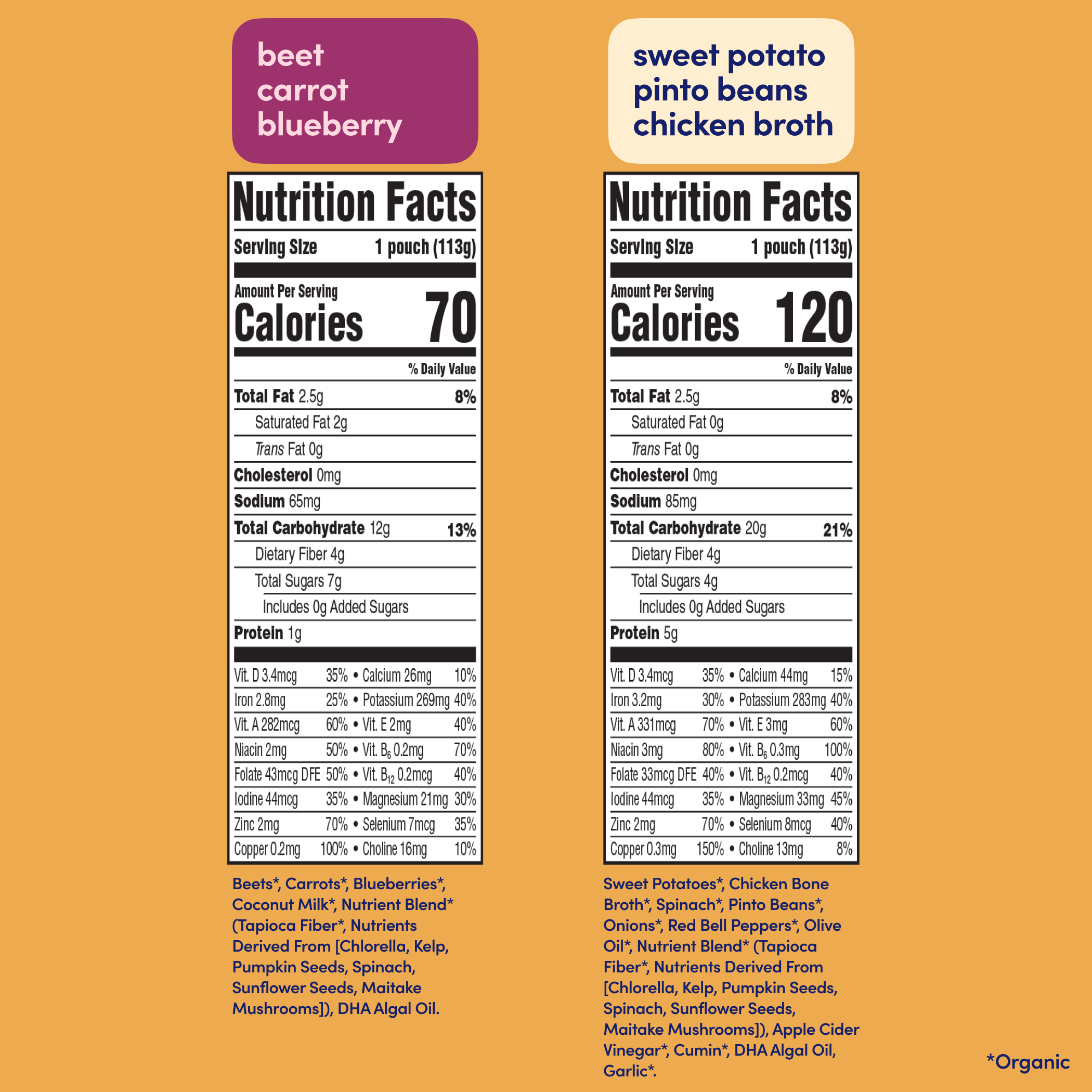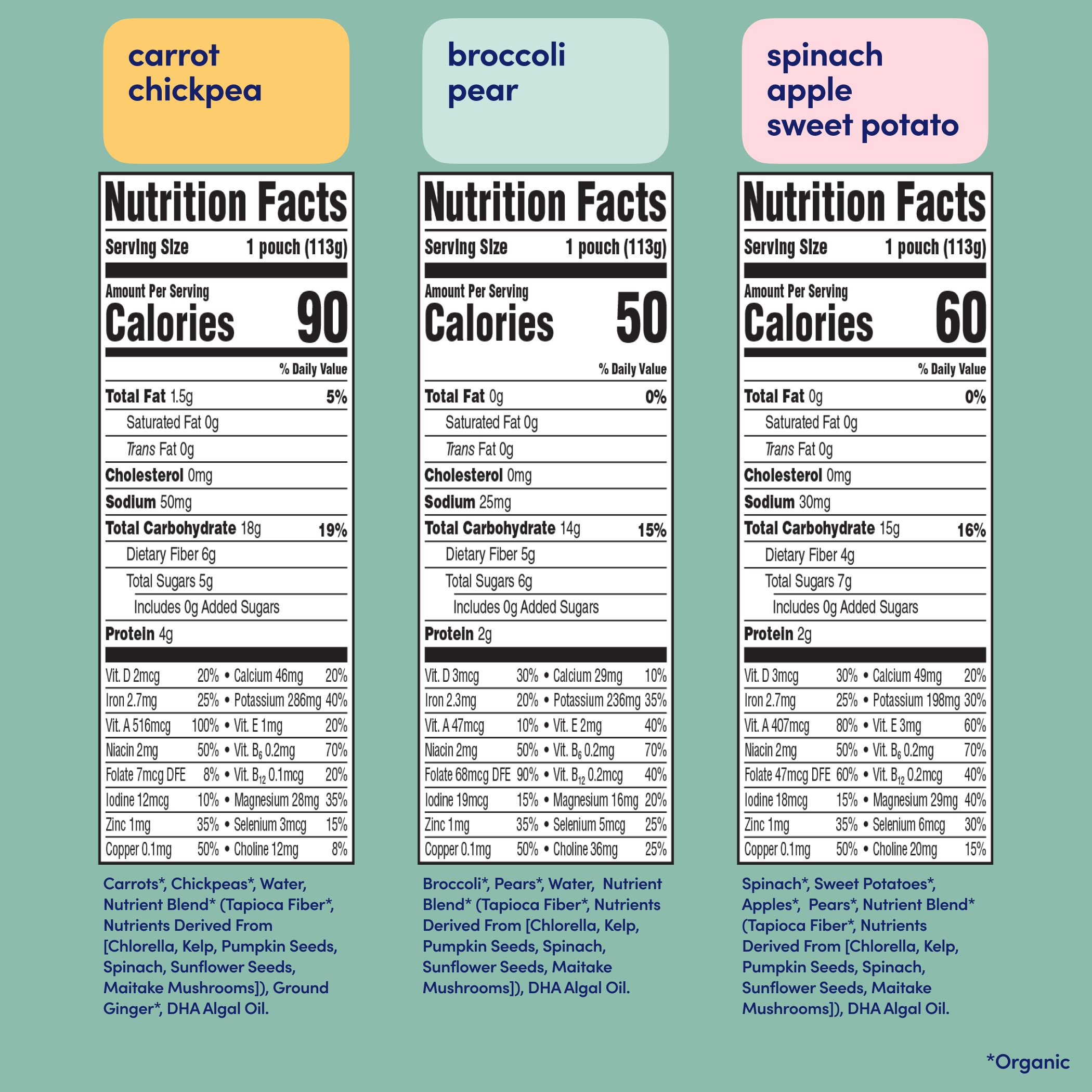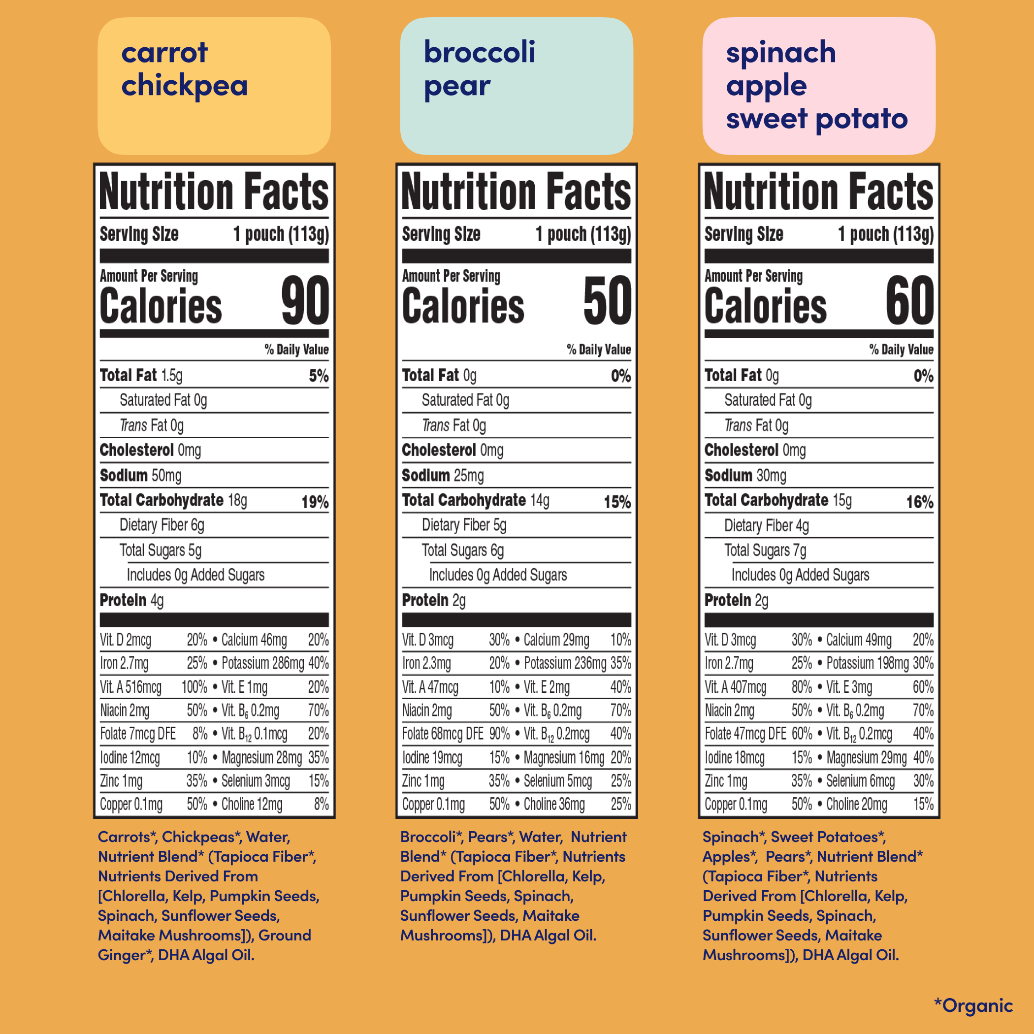 *Among competing baby food pouches with similar ingredients as of April 2024. Normalized per 113 grams.