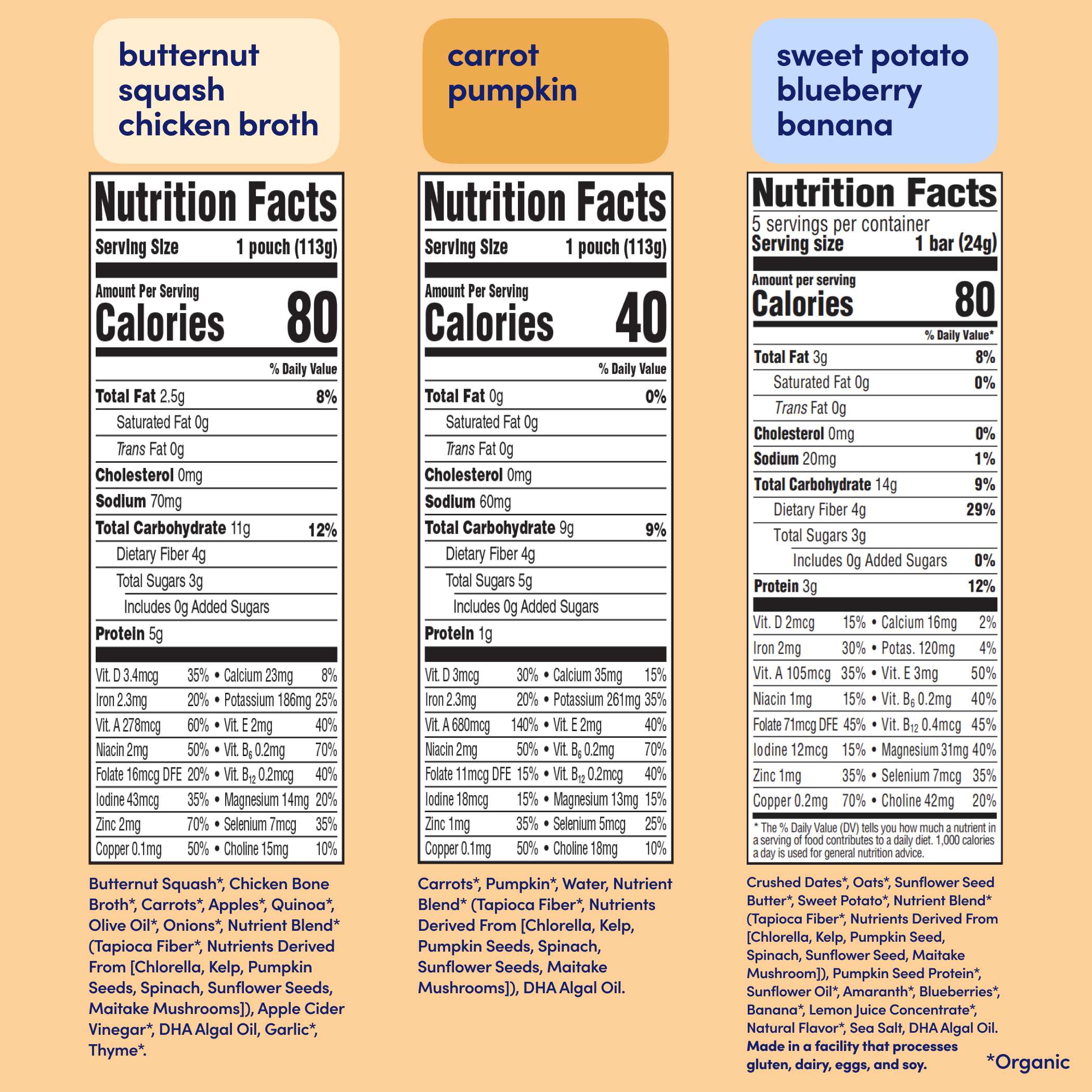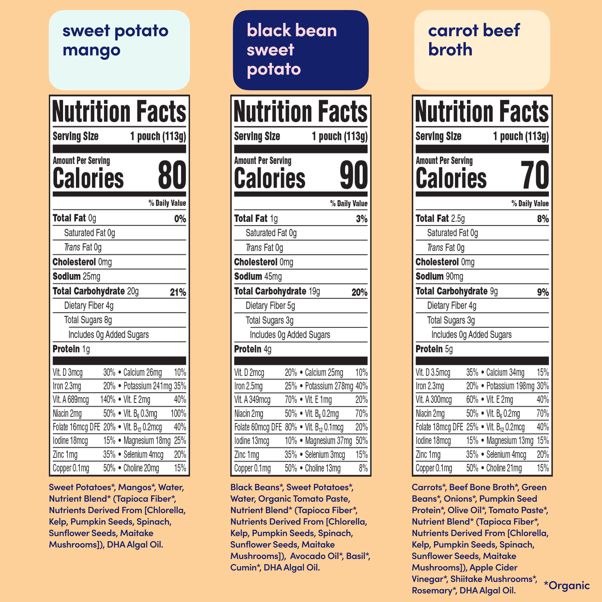 *Among competing baby food pouches with similar ingredients as of April 2024. Normalized per 113 grams.