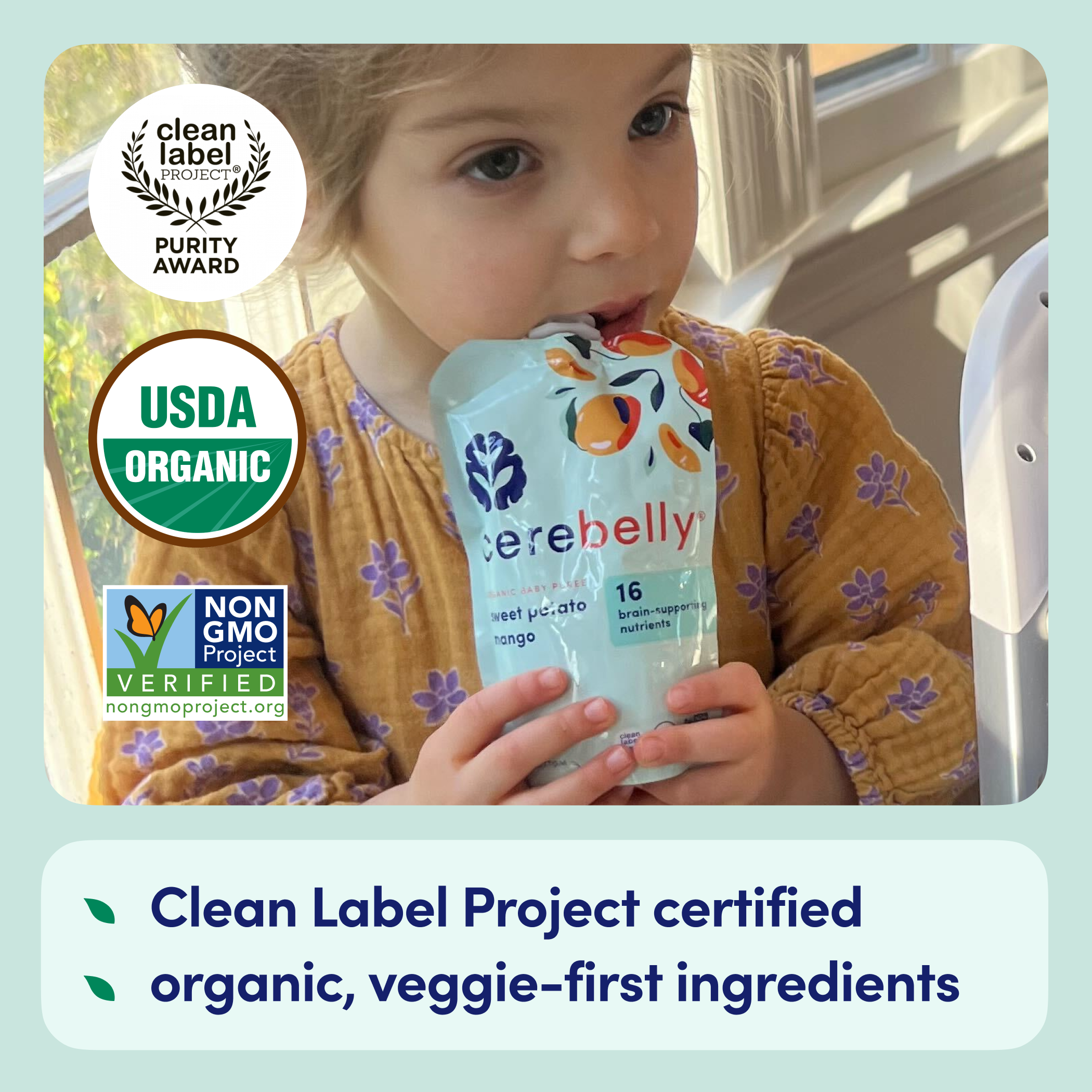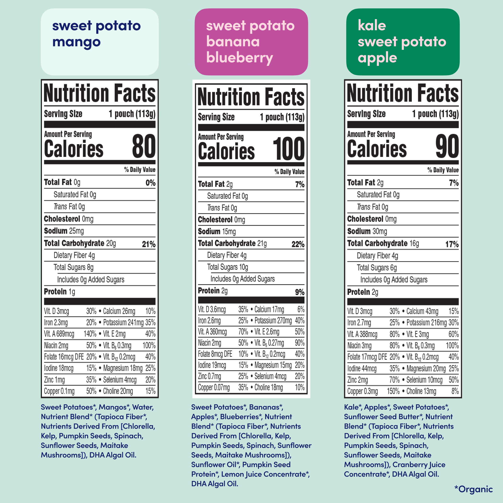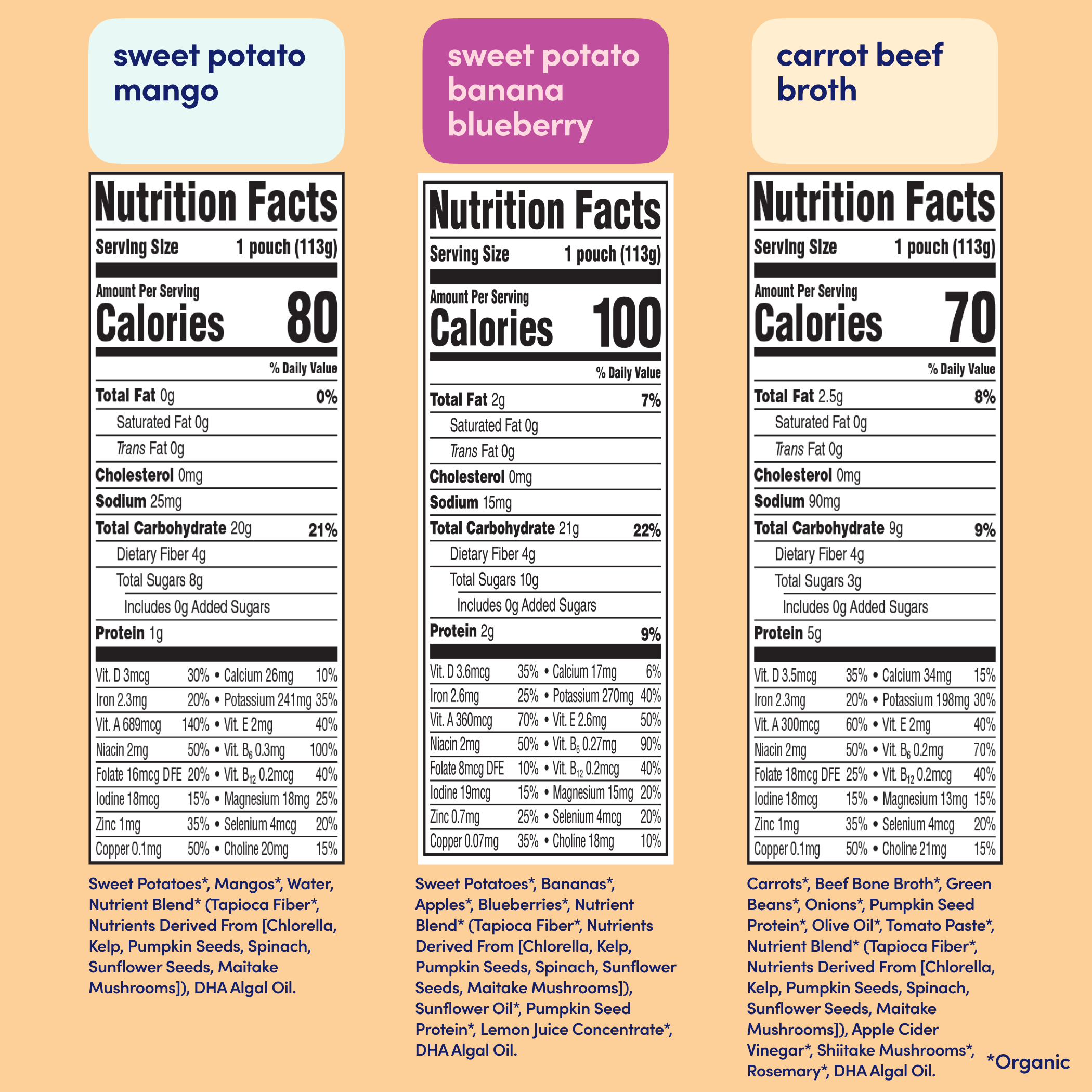 *Among competing baby food pouches with similar ingredients as of April 2024. Normalized per 113 grams.
